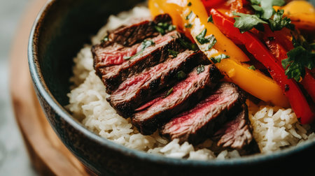 A delicious serving of tender beef steak beautifully sliced and paired with colorful saut