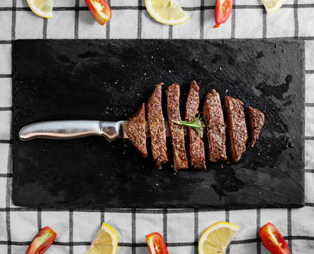 Grilled beef steak, Tenderloin on black stone plate with Rosemary, tomatoes and lemon