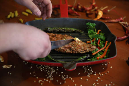 Chef preparing grilled steak in creamy lemon butter or spicy cajun sauce with herbs