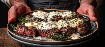 Tender steak cooked to perfection is being carefully garnished with aromatic herbs. The rich sauce enhances its flavor, creating an appetizing presentation ideal for a fine dining experience.