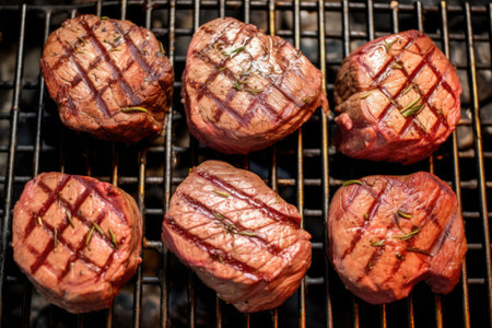 top-down view of several filet mignon slices on a grill, created with generative ai