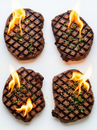 Four perfectly grilled steaks with flaming butter topping, showcasing beautiful grill marks and a delicious food presentation, ideal for a steakhouse or BBQ setting.