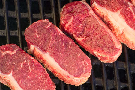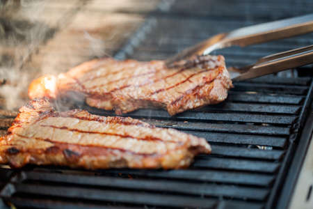 grilling raw steaks on gas grill and shot with selective focus.