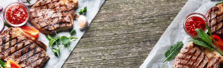 Grilled beef steaks on wooden board. Top view with copy space. Panorama, banner