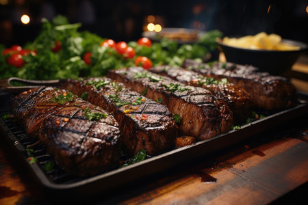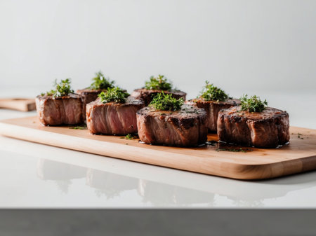 AI Generated. Several juicy cooked steaks garnished with herbs are resting on a cutting board