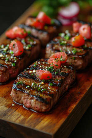 Juicy grilled steaks are beautifully arranged on a wooden platter, topped with fresh diced tomatoes and herbs. This delicious dish is being served at a backyard barbecue, perfect for summer gatherings among friends.