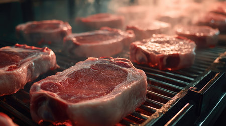 A factory scene with raw pork cuts being inspected on a production line, leaving room for text or branding.
