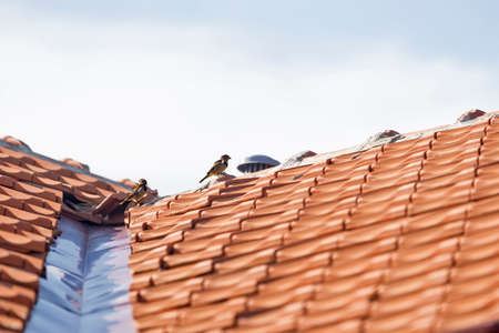 The texture of the red ceramic Tiles on the Roof of a House with Blue Sky background