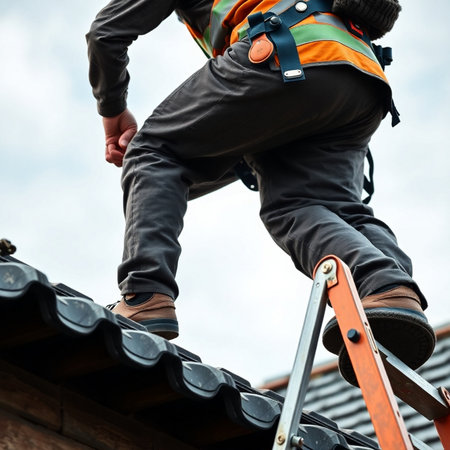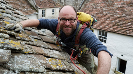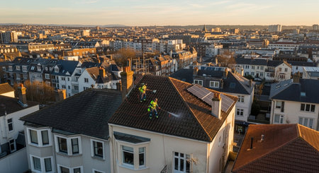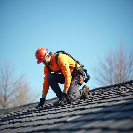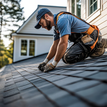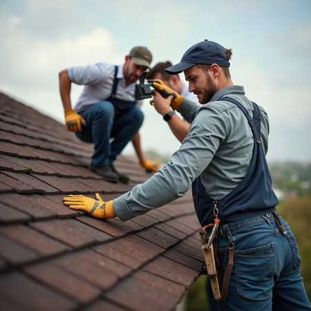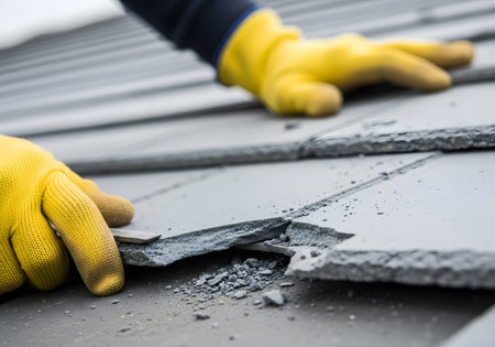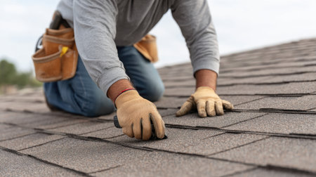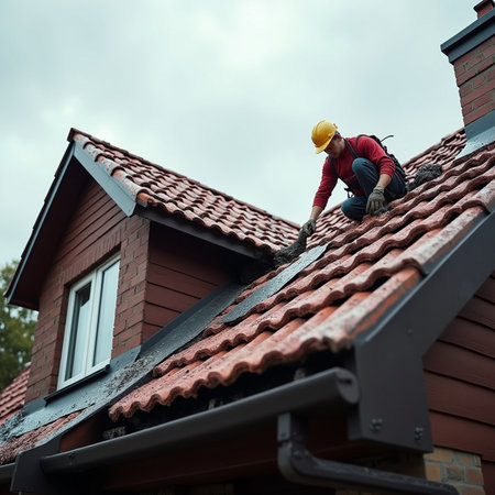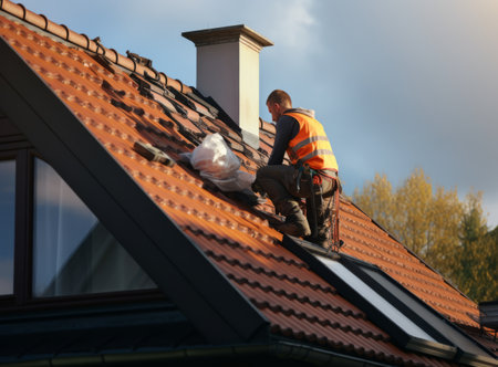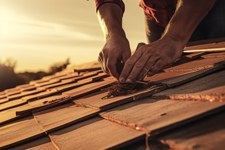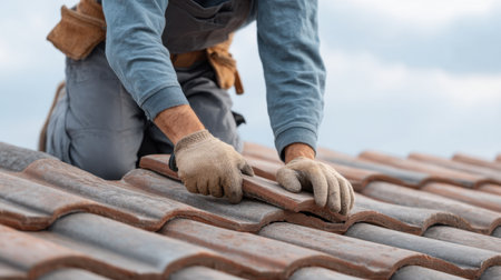 Close-up of a construction worker's hands carefully placing a new clay tile onto a residential roof structure