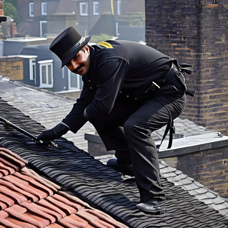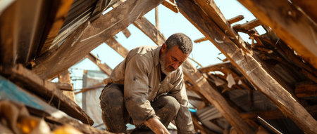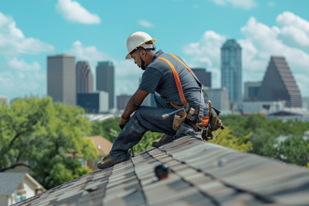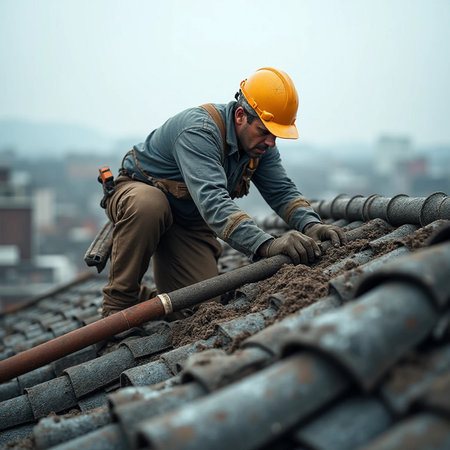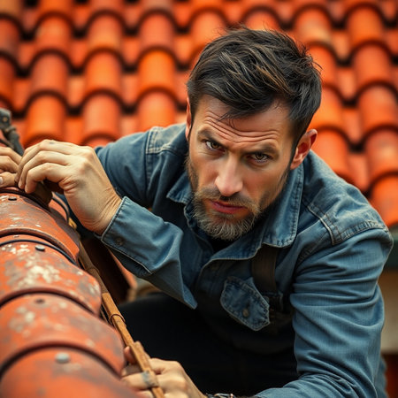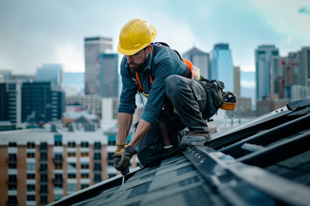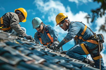 A proficient craftsman carefully places vibrant roof tiles under bright sunlight, ensuring durability and craftsmanship on a bustling construction site.