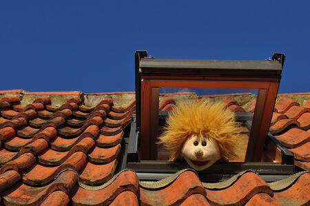Semi round skylight. Roof covered with tiles and a semicircular window in a European city, with text space