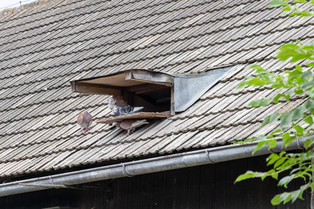Hole in the roof of a residential building. Repair of a tile roof after a storm damage.