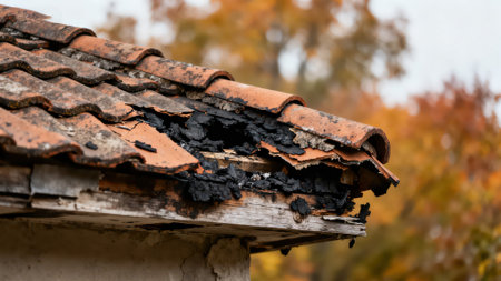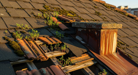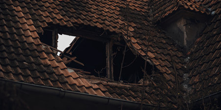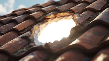 A detailed image capturing a damaged terracotta tile roof against a bright sky, showcasing age and weathering. The texture, damage, and contrast of the tiles create a visual narrative.