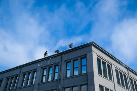 Riga, Latvia: February 12, 2021: Team of male workers clean roof of building from snow with shovels in securing belts. Selective focus