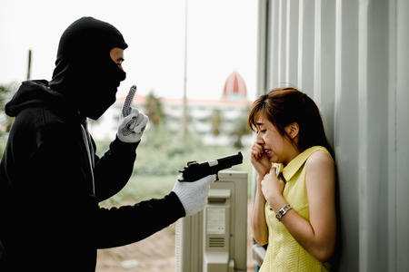 Criminal or Bandit wear black mask and black clothes using gun point to woman for rob money and hurting her.