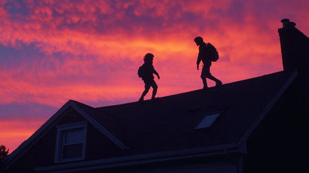Roofing Crew At Work in the Morning - Black and White - Silhouette