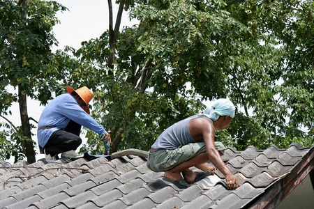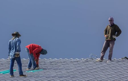 Bangkok, Thailand - 13 Jun 2020 : Three handyman workers repairing tiles on the damaged factory roof.