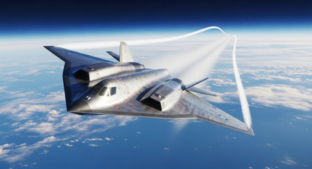 Futuristic hypersonic stealth jet flying at extreme altitude above earth atmosphere, leaving prominent contrails against the deep blue sky.