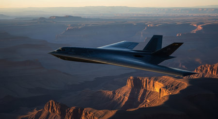 Cutting edge stealth bomber aircraft flying over a vast, rugged desert canyon bathed in warm light at sunrise.