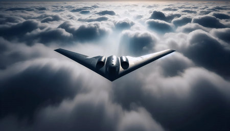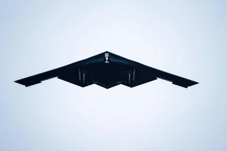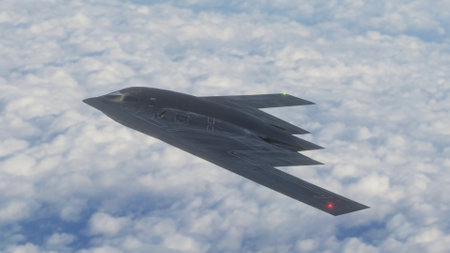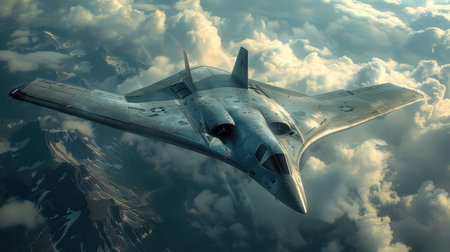 A striking view of a stealth bomber during flight, emphasizing its unique shape, stealth technology, and the power of modern military aircraft.