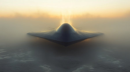 supersonic fighter jet races through mist covered sky during sunset, generating cone shaped vapor burst from its wings, illustrating extreme aerodynamic forces