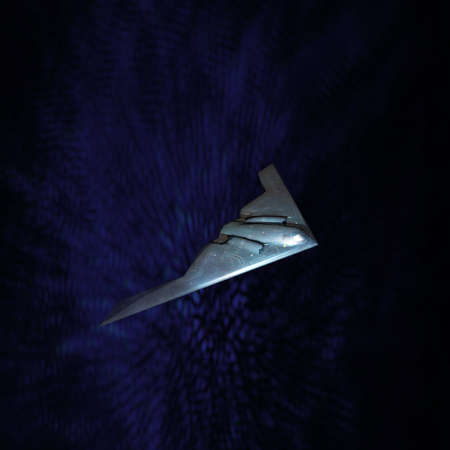 A digital illustration depicts a stealth fighter jet gliding over a rural landscape, highlighting the juxtaposition of advanced technology and natural terrain