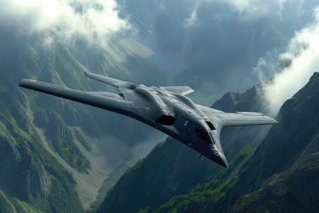 A fighter jet flies dynamically over a magnificent mountain range, showcasing the power and agility of modern military aircraft, Advanced stealth bomber flying over mountain range, AI Generated