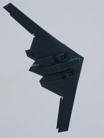 09-11-2021 Columbus, OH, USA: A Northrop Grumman B-2 A Spirit Stealth bomber of US Airforce flying above Ohio. It can carry both conventional and nuclear missiles.