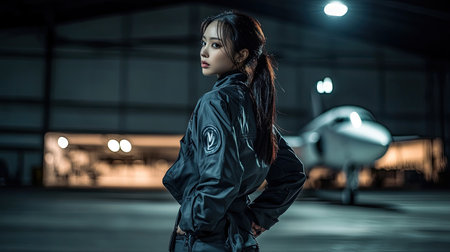 photo of an Asian woman model in a flight engineer's suit, back view, airplane hangar blurred in the background, industrial lighting creating a technical mood, focus on her stance and professional appearance, advertising shoot, professional photo, photorealistic --chaos 10 --ar 16:9 --v 6.1 Job ID: 76d5af70-48e4-4eea-be51-5b21990d4dae