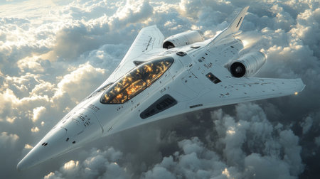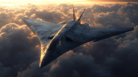 Innovative Spaceplane Design Soaring Through Vibrant Clouds During a Breathtaking Sunset, Showcasing Advancements in Aerospace Technology and Hypersonic Travel Generative AI