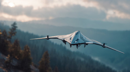 Futuristic delivery drone flying over mountainous wilderness landscape, autonomous aerial vehicle technology for remote transportation and logistics innovation.