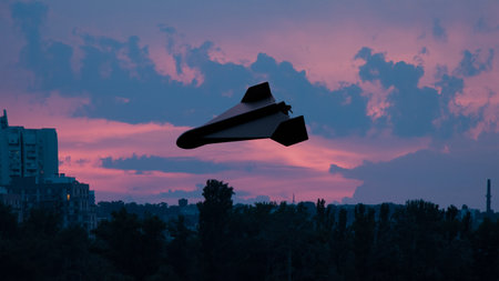 Unmanned combat aerial vehicle against the backdrop of a city in Ukraine in the evening at sunset, drone attack on the city and drone war