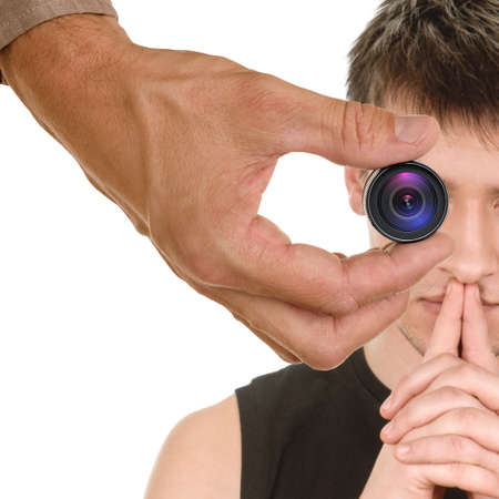 Man with photo camera photographing something very concentrated, looking straight ahead. Mid shot. White background.