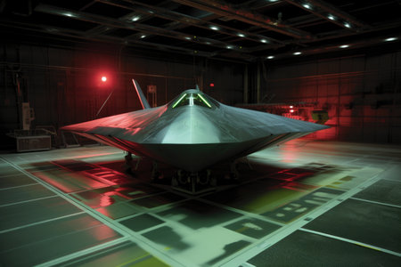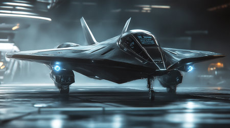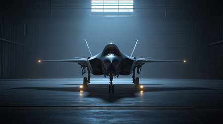 AI Generated. Stealth Fighter Jet in Spotlight at Modern Hangar