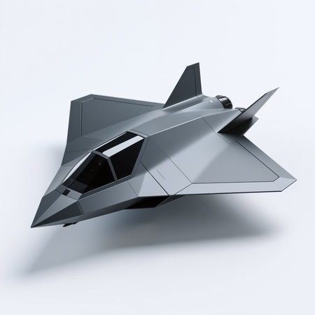 A sleek, gray, futuristic fighter jet with sharp angles, symbolizing advanced military technology and stealth capabilities, set against a clean white background.