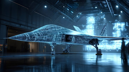 Wireframe hologram of a next-generation jet fighter undergoing development and testing within a technologically advanced hangar, showcasing the innovative design and engineering process