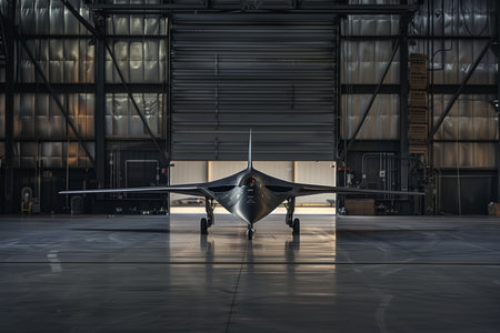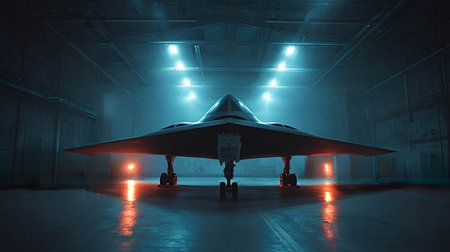 Stealth bomber sitting inside a dark military hangar with dramatic blue and orange lighting, showcasing advanced aerospace technology and defense concept
