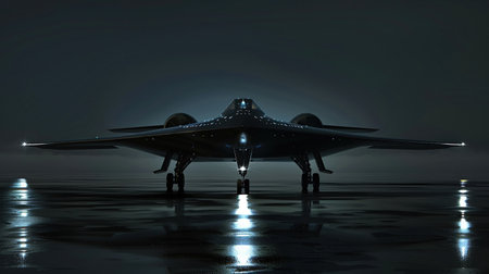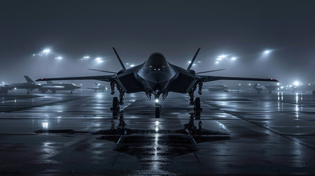 Stealth aircraft parked in dimly lit darkness on a wet tarmac, illuminated by reflective lights, capturing the mysterious and formidable aura of modern aviation technology.
