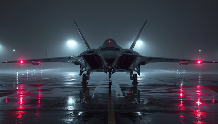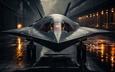 Stealth jet on wet tarmac at night, moody lighting, dramatic