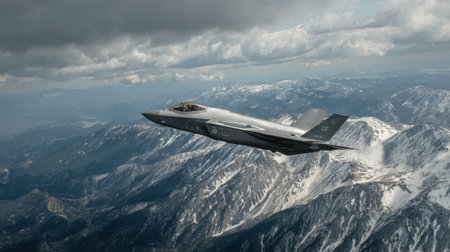 A military jet soars above stunning snow-covered mountains under a cloudy sky. The scene captures the power and agility of the aircraft in flight.