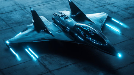 futuristic fighter jet in the dark with blue neon light.