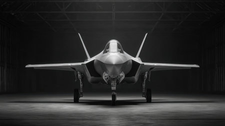 A sleek stealth fighter jet stands menacingly in a dark hangar, illuminated by soft lights, showcasing modern military aviation technology and design elements.