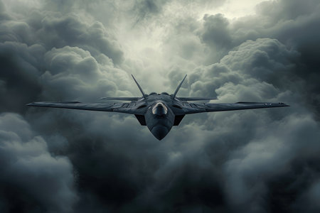 A powerful fighter jet streaks through the cloudy sky, leaving a trail of exhaust as it cuts through the air, Stealth fighter jet against a stormy sky, AI Generated