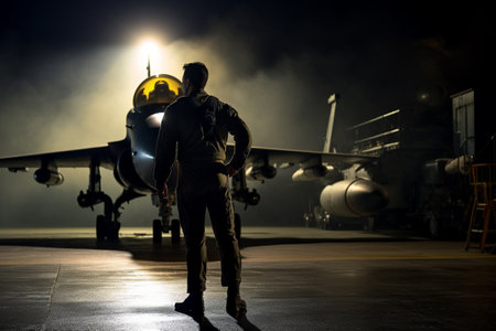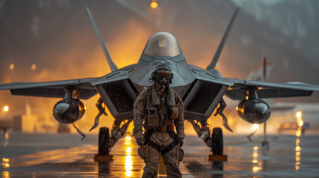soldier standing front of the jet at the night bokeh style background