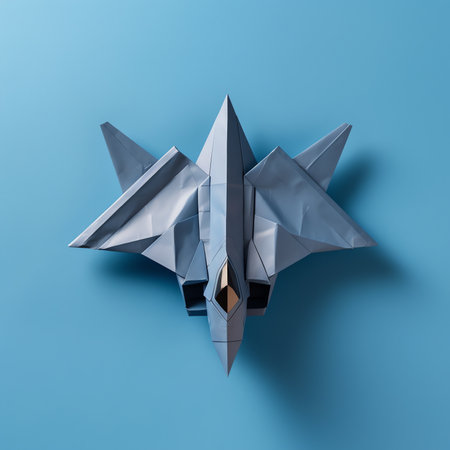 Origami paper airplane mockup. Selective focus. Blue background
