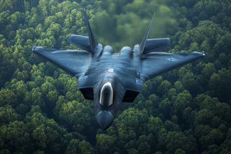Low flying military aircraft soars over dense forest, showcasing speed and precision control