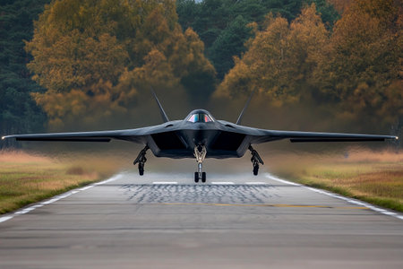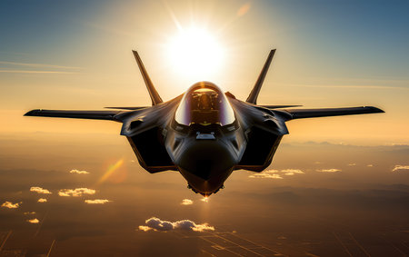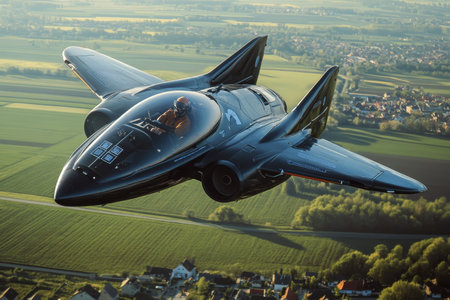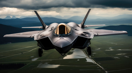 A digital illustration depicts a stealth fighter jet gliding over a rural landscape, highlighting the juxtaposition of advanced technology and natural terrain