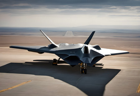 A futuristic stealth fighter jet rests on an aircraft carrier deck, concept advanced technology and power.