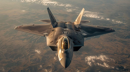 A military fighter jet soars through the sky on a mission. Military aircraft flying over the ground.