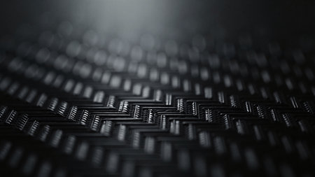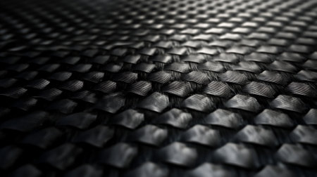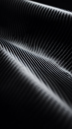Extreme close-up capturing the texture of woven carbon fiber, revealing subtle waves and intricate patterns, with dramatic shadows and bright highlights emphasizing its depth and form.